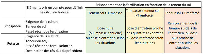 Tableau 2 : Principe de calcul de la dose en phosphore et potassium