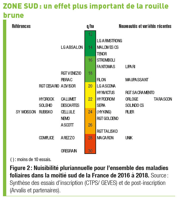 Dans la zone sud (figure 2), la septoriose et la rouille brune restent les maladies les plus fréquentes et, en règle générale, les plus nuisibles. Toutefois, la rouille jaune est plus régulièrement observée depuis 2012, notamment sur les variétés les plus sensibles. La nuisibilité globale (toutes maladies confondues) a été plus élevée que dans le nord de la France, avec une moyenne pluriannuelle (2016-2018) de 18 q/ha et une moyenne pour 2018 de 23 q/ha.