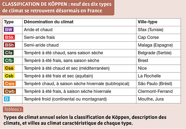 La classification de Köppen permet de caractériser le type de climat en fonction des régimes des précipitations et des températures. La méthodologie définit un type de climat annuel pour chaque année d’une période d’étude parmi les dix types possibles (tableau 1).