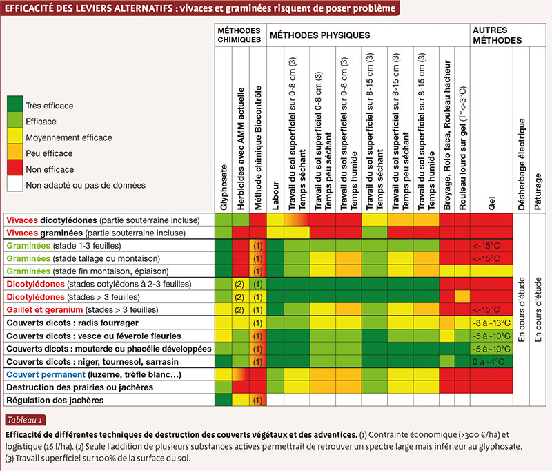 Les différentes opérations décrites ne sont pas applicables dans toutes les conditions ; leur faisabilité dépend du type de sol et de son humidité, de l’occurrence ou non de gelées, etc. Parmi les méthodes citées, c’est le travail du sol qui donne globalement les meilleurs niveaux de destruction. Le résultat dépend du matériel, du climat et de la flore à détruire. Ainsi, les graminées sont les plus difficiles à détruire ; en dehors du labour, elles sont peu sensibles à la plupart des techniques alternatives au glyphosate. Quant au travail superficiel, son efficacité est très dépendante du climat sur ce type de cible : les conditions doivent être impérativement séchantes.