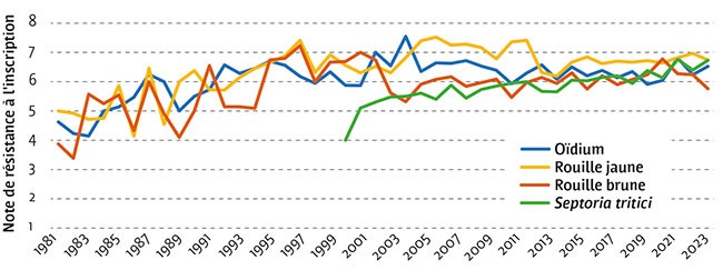 Figure 1 : Évolution du niveau de résistance moyen des variétés de blé tendre aux maladies foliaires. Plus la note de résistance augmente, plus la variété est résistante pour la maladie considérée.